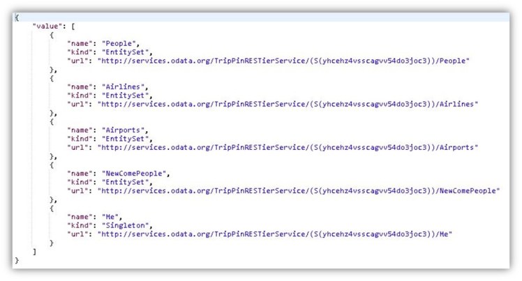 The example above returned five entities called “People”, “Airlines”, “Airports”, “NewComePeople” and “Me”. Entities are instances of Entity Types. You can think of an Entity Type like C# Class when the type is EntitySet or Singleton. Not shown are any Annotations which may also be included.