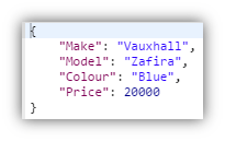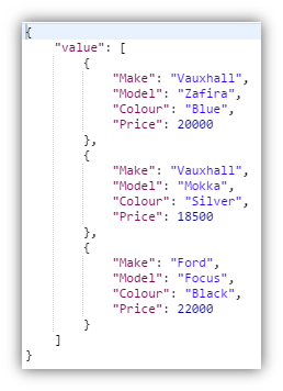 From Postman issue a GET request with http://localhost:40000/OData/Cars(Make = ‘Vauxhall’, Model = ‘Zafira’) to fetch a single car.