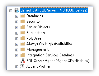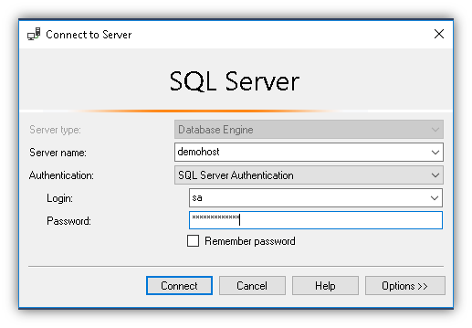 We can use the hostname demohost or the IP address. Also since we specified –p1433:1433 when creating the container, we do not need to specify a port number.