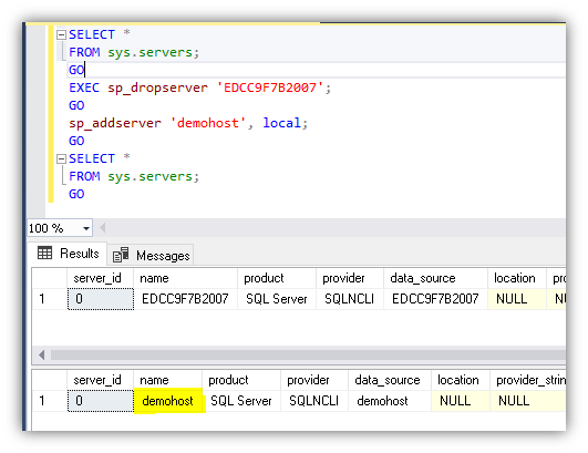 Notice the SQL Server server name above. This is the name of the container at the time SQL Server was installed and the image generated. Let’s change it to match the demohost name.