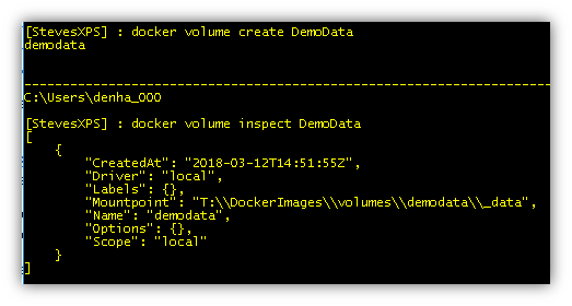If we go back to Part 1 of this blog I showed how we can change the docker configuration so that all images and containers can be located on T:\DockerImages rather than the C Drive. Let’s create a volume.