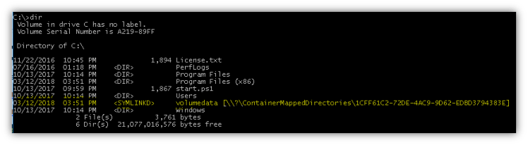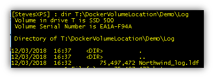 Now we have a running container let’s check the folder inside the container. If you notice the docker create above, there should be a folder inside the container called C:\VolumeData which maps to the T drive on the container host.