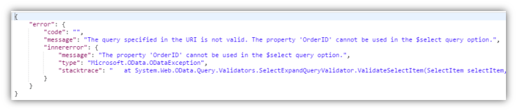 We get an error. In order to play with properties on the Order entity we need to define an entity set in the WebApiConfig.cs