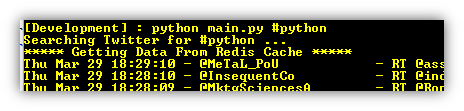 The app does a twitter search using a passed in search string. The results are stored in Redis using the search string as the key. The key has a Time to Live (TTL) of 30 seconds. If an identical search is done within 30 seconds, the data is pulled from Redis by the client. After 30 seconds the key is automatically deleted and the app redirects the request to Twitter the next time the same search is requested. Here is an example of the output returned. It is run using python main.py #python to return the latest 20 tweets that mentioned #python.