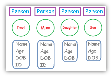 Here we have 4 nodes that represent the four family members. From Neo4j perspective, these are 4 very distinct nodes that represent 4 different entities however; in the real world we naturally group things into sets. Take a look at the 4 nodes below.