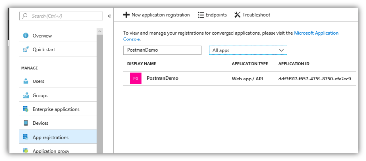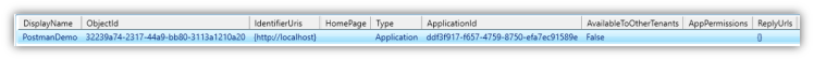 New-AzureRmADApplication -DisplayName “PostmanDemo” -IdentifierUris http://localhost