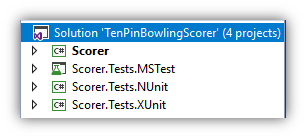 The solution is called TenPinBowlingScorer. The code is in the Scorer project which is a .NET framework library. I created a project for each unit testing framework. The examples in the blog will show NUnit. Just refer to the source code for the others.