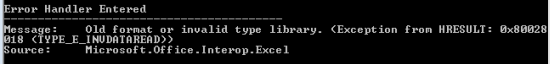Hmmm. Luckily I found this Microsoft support article. https://support.microsoft.com/en-gb/help/320369/bug-old-format-or-invalid-type-library-error-when-automating-excel