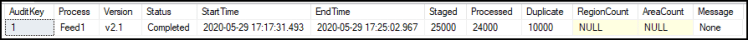 EXEC sp_Audit_Update @AuditKey = 1, @Staged = 25000, @Processed = 24000, @Duplicate = 10000, @Status = 'Completed'