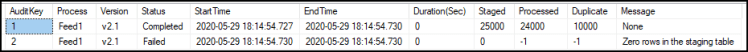 Feed1 failed because there were no rows in the staging table as indicated by the Message column. Let’s include an entry from the Feed2 process.