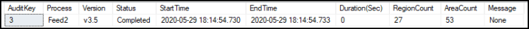 Feed1 shows it is currently running (Started) or has crashed and not updated the row. The Version column can be used to log the version of the Feed1 process to ensure the correct version is running. Let’s update the row to show success. I am hardcoding the AuditKey for demonstration purposes however; this would be stored in a variable and referenced by the code.